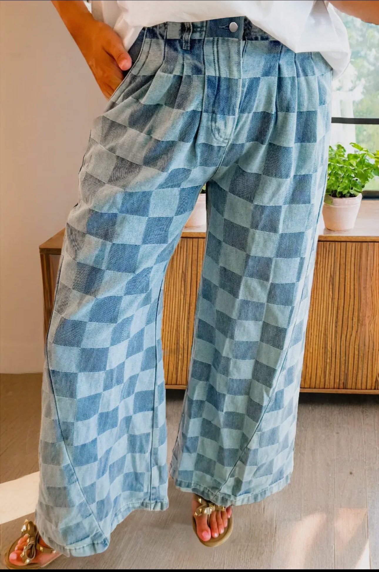 Checkered Wide Leg Denim Jeans